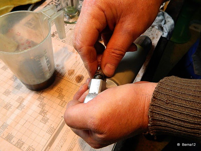 Attendre 1 mn ,afin que l'huile descende au fond de l'amortisseur et recommencer en compriment (lentement) ..........